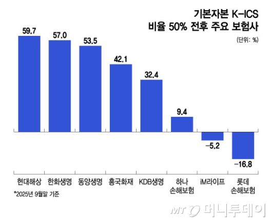 기본자본 K-ICS 비율 50% 전후 주요 보험사/그래픽=윤선정 |