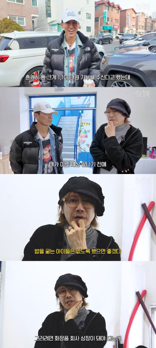 션과 마주한 김장훈은 "나는 4년 전에 목표를 정한 게 있다. 내가 죽더라도 이 땅에 밥을 굶는 아이들은 없으면 좋겠다고 생각했다"며 "그러려면 화장품 회사가 상장이 되어야 하는데 쉽지 않을 것 같다"고 걱정을 드러냈다.