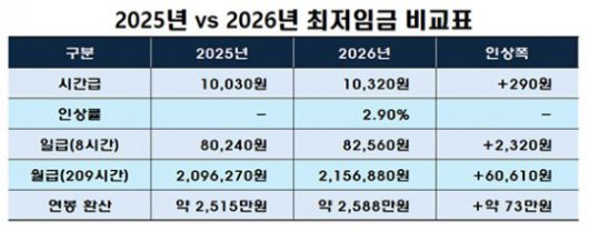 [한국금융신문 마혜경 기자] 2026년부터 대한민국에서 일하는 모든 근로자에게 적용되는 법정 최저임금이 시간당 10,320원으로 최종 확정됐다. 이는 2025년 최저임금 10,030원보다 290원(2.9%) 인상된 금액으로, 주 40시간 근무 기준 ‘월 환산액은 약 215만6,880원(월 209시간 기준)’에 이르게 된다.