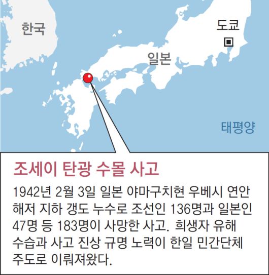 조세이 탄광 사고는 1942년 해저 지하 갱도 누수로 조선인 136명과 일본인 47명 등 모두 183명이 수몰돼 사망한 사건이다. 그간 양국 시민단체 간 이뤄진 유해 발굴 협력을 양 정상이 정부 차원으로 끌어올린 것. 이곳에 묻혀 있는 조선인 희생자 유해가 84년 만에 귀환할 수 있을지 관심이 쏠린다. 김숙현 국가안보전략연구원 책임연구위원은 “위안부나 강제징용 문제가 가해자, 피해자 입장에서 접근이 이뤄졌다면 조세이 탄광 협력은 과거사를 인도적 차원에서 접근하는 새로운 시도로 볼 수 있다”고 분석했다.