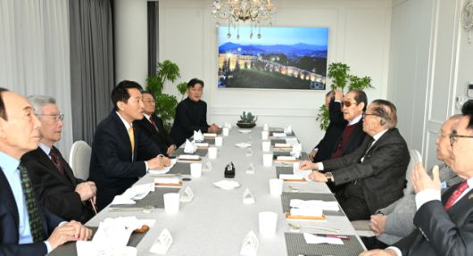 ▲오세훈 서울시장이 12일 서울 한남동 파트너스하우스에서 국민의힘 상임고문단과 신년간담회를 하고 있다. ⓒ연합뉴스 |