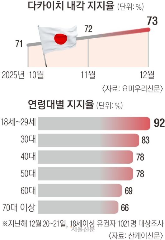요미우리신문이 지난달 22일 공개한 전국 여론조사(19∼21일 실시)에 따르면 다카이치 사나에 정부 지지율은 73%로 집계됐다. 내각 출범 이후 두 달 넘게 70%대를 유지하고 있다. 내각 출범 직후부터 이 같은 지지율을 이어간 사례는 호소카와 모리히로(1993년), 고이즈미 준이치로(2001년) 내각 이후 처음이다.