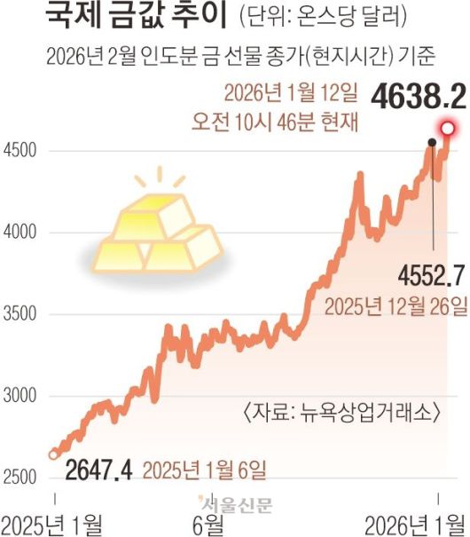 12일(현지시간) 뉴욕상업거래소(COMEX)에서 2월 인도분 금 선물 가격은 미 동부시간 오전 10시 46분 기준 전 거래일보다 3.1% 오른 온스당 4638.2달러에 거래됐다. 금 선물이 4600달러선을 넘어선 것은 역대 처음 있는 일로, 장중에는 4640.50달러까지 오르며 상승 폭을 키웠다.