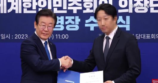 이모 전 통일교 중앙행정실장이 지난 2023년 4월 국회에서 당시 이재명 대표로부터 더불어민주당 세계한인민주회의 부의장 임명장을 받고 있다. 유튜브 '오마이TV' 캡처 |