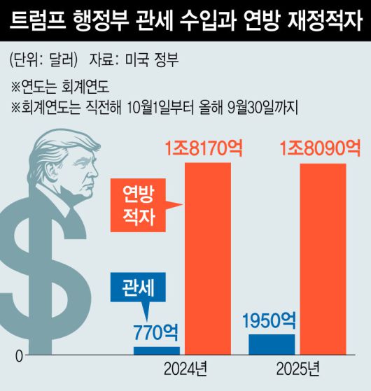우선 관세 세입이 많지 않았다. 2025 회계연도(2024년 10월 1일~2025년 9월 30일) 미국은 1950억 달러(약 282조원) 관세를 징수했다. 전년도보다 1180억 달러, 153% 증가한 수치다. 하지만 1조 8000억 달러에 달하는 연방 재정적자와 비교하면 약 11% 수준에 불과하다. 관세수입에도 불구하고 연방 재정적자는 80억 달러(0.44%) 줄어드는 데 그쳤다.
