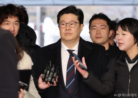 [서울=뉴시스] 황준선 기자 = 홈플러스 사태와 관련해 사기와 자본시장법 위반 등 혐의를 받는 김병주 MBK파트너스 회장이 13일 오전 서울 서초구 서울중앙지방법원에서 열린 구속 전 피의자 심문(영장실질심사)에 출석하고 있다. 2026.01.13. hwang@newsis.com /사진=황준선 |