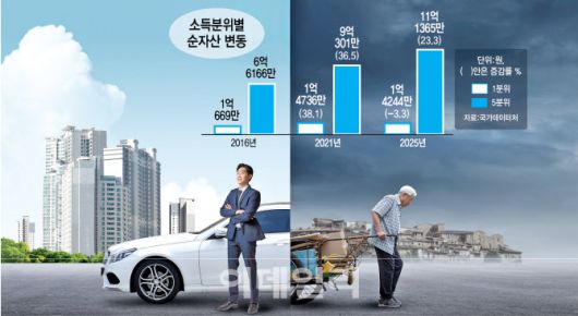 최근 15년 간을 보면 소득 1분위와 5분위의 순자산 격차는 점차 빠르게 확대되고 있다. 2011년에는 1분위 순자산액은 9401만원, 5분위는 5억 3258만원으로 약 5.6배 차이였다. 2015년 1분위와 5분위의 순자산액은 각각 1억 616만원, 6억 2708만원으로 그 격차가 약 6배였으며, 2020년엔 1억 1854만원, 7억 9519만원으로 약 6.7배로 완만하게 확대됐다.