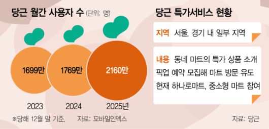 지역 커뮤니티 플랫폼인 당근이 최근 수도권에서 동네 마트의 특가 상품 픽업 서비스를 시범 운영 중인 것으로 나타났다. 당근이 동네 음식점과 함께 포장 주문 서비스를 내놓은 데 이어 지역의 마트와 함께 동네 주민들의 장보기 수요까지 연결하고 나선 것이다. 고물가에 알뜰 쇼핑에 대한 수요가 늘어나고 있는 만큼 대형마트, 기업형슈퍼마켓(SSM)도 당근의 서비스에 참여할지 주목된다.