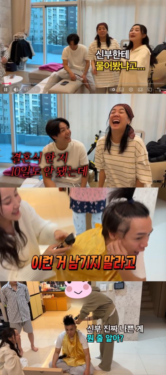 삭발의 마지막은 미르의 아내가 하기로 했다. 미르는 "신부가 진짜 나쁜 게 뒤부터 밀고 있다 열받는다"며 발끈해 웃음을 자아냈다. 그렇지만 모든 삭발을 끝낸 아내는 시누이들을 향해 "근데 언니 괜찮지 않아요?"라며 흡족해해 눈길을 끌었다.