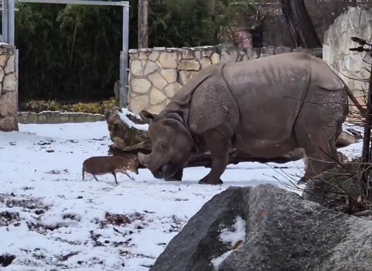 해당 영상은 폴란드 브로츠와프 동물원의 공동 사육장에서 촬영됐습니다. 수컷 문착사슴은 암컷 코뿔소 '마루슈카'를 향해 망설임 없이 돌진하며 여러 차례 머리를 맞댔고, 코뿔소는 공격하지 않은 채 가볍게 대응해 사고 없이 상황이 마무리됐습니다.