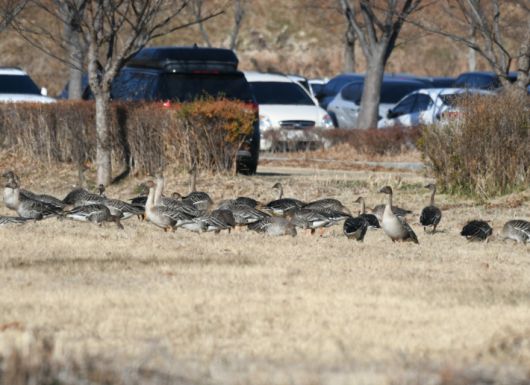 부산시가 추진 중인 철새 대체서식지 예정지인 대저생태공원에 큰기러기 무리가 쉬고 있다. 습지와새들의친구 제공 |