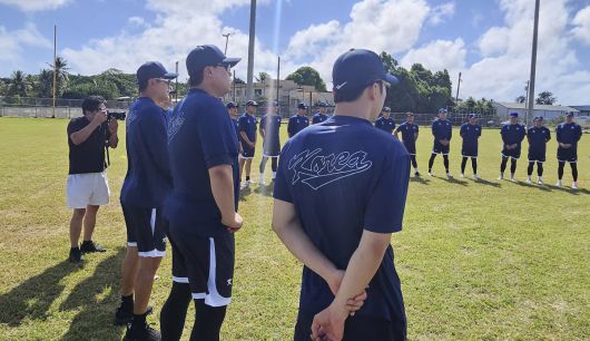 형님의 한말씀 류현진(왼쪽에서 두번째)이 지난 11일 사이판 올레아이 구장에서 진행된 야구대표팀 훈련에 앞서 선수들에게 메시지를 전하고 있다. 사이판 | 심진용 기자 |