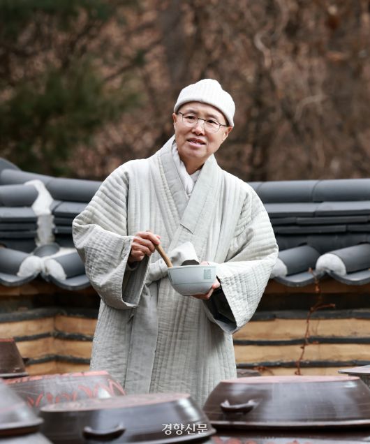 선재스님이 경기도 양평 선재사찰음식연구소 뒷마당 장독에서 30년 된 간장을 보여주며 “간장은 오래될수록 점성이 생기고 단맛이 난다”고 설명했다. 정지윤 선임기자 |