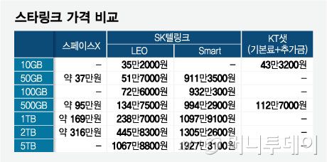 LEO 요금제는 데이터 제공량 기준 매월 △10GB(기가바이트) 35만2000원 △50GB 51만7000원 △100GB 72만6000원 △500GB 134만7500원 △1TB 238만7000원 △2TB 445만8300원 △5TB 1067만8800원이다. 모두 스페이스X 요금의 1.4배 수준이다. SI(시스템통합) 사업자처럼 설계, 컨설팅, 유지·보수 등 서비스를 통합 제공해서다. 다만 실제 요금은 계약 대수, 거래 규모 등에 따라 조정된다.