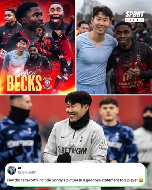 영국 '스포츠 바이블'은 14일(한국시간) "탬워스 FC는 베크-레이 에노루의 노츠 카운티 이적을 알리는 작별 게시물에 손흥민과 함께 찍은 사진을 게재했다. 이 사진은 지난해 논리그(세미프로) 팀인 탬워스가 FA컵에서 토트넘과 맞붙었을 때 찍은 것이다"고 이야기했다.