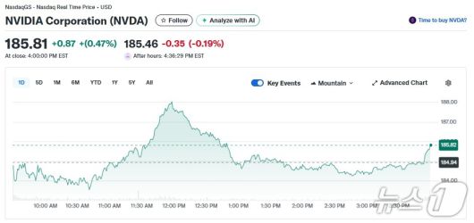 13일(현지 시각) 뉴욕증시에서 엔비디아는 0.47% 상승한 185.81달러를 기록했다. 이에 따라 시총도 4조5240억달러로 늘었다.