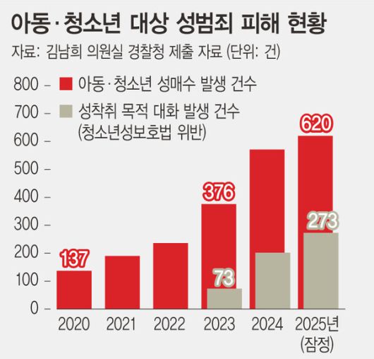 13일 김남희 더불어민주당 의원실이 경찰청에서 제출받은 자료를 보면, 아동·청소년 성매수 발생 건수는 2020년 137건에서 2025년(잠정통계) 620건으로 6년 새 4.5배 늘었다. 2021년 190건, 2022년 236건, 2023년 376건, 2024년 571건 등으로 늘어나 2020년부터 2025년까지 연평균 증가율이 35%에 이른다. 그루밍 같은 성착취 목적 대화 발생 건수도 2023년 73건에서 2024년 202건, 2025년 273건으로 늘어나는 추세다. 아동·청소년 성착취물을 제작·배포하는 등의 디지털 성범죄 발생 건수는 2020년 9700건에서 2024년 1만5411건으로 58.9% 늘었다.