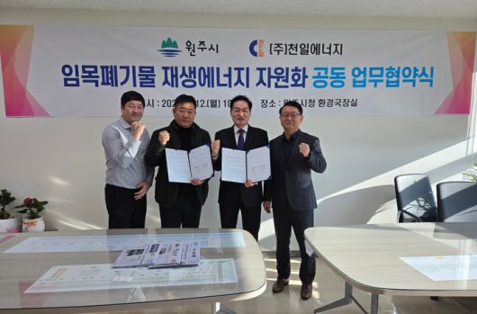 [스포츠서울ㅣ원주=김기원기자]원주시는 지난 12일 시청에서 ㈜천일에너지와 ‘임목폐기물 무상처리 업무협약’을 체결하고, 관내에서 발생하는 임목폐기물을 친환경 재생에너지로 전환하는 데 협력하기로 했다.