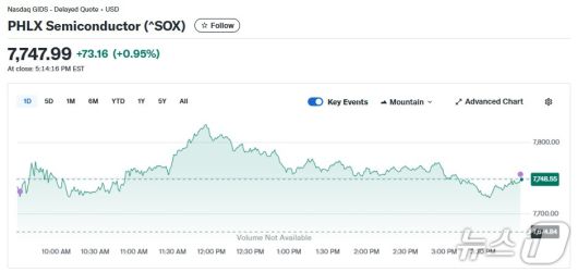 13일(현지 시각) 뉴욕증시에서 반도체지수는 0.95% 상승한 7747.99포인트를 기록했다.