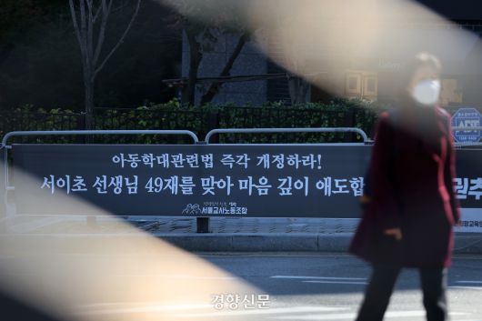2023년 11월 서울시교육청 앞에 서초구 초등 교사를 추모하는 현수막이 걸려 있다. 조태형 기자 |