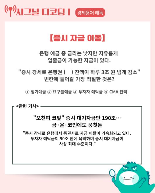 ■ 자금 대이동: 코스피가 8거래일 연속 상승하며 4700선에 근접하자 5대 은행 요구불예금이 이달 들어 27조 원 넘게 감소했다. 증시뿐 아니라 금과 가상화폐로도 자금이 분산되면서 일평균 3조 9000억 원이 빠져나가는 이례적 양상이다.