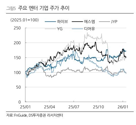 DS투자증권은 메가 지식재산권(IP)인 BTS 복귀에 따라 하이브의 실적 개선 폭이 업종 내에서 가장 두드러질 것으로 전망했다. 2026년 1분기에는 BTS 신보 발매 효과가 반영되고, 2분기부터는 월드 투어 실적이 본격적으로 인식될 것으로 내다봤다. 여기에 고연차 IP 활동 재개와 함께 저연차 IP, 해외 IP 성장이 동시에 나타나며 IP 레버리지가 확대될 것이란 분석이다.