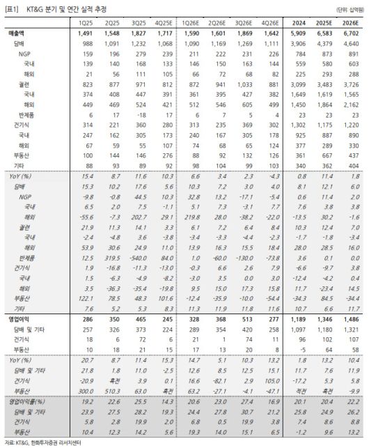 한 연구원은 KT&G의 2025년 4분기 연결 실적이 시장 기대치에 부합할 것으로 전망했다. 4분기 연결 매출액은 1조 7170억원으로 전년 동기 대비 10.3% 증가하고, 영업이익은 2450억원으로 15.3% 늘어날 것으로 추정했다. 영업이익은 컨센서스(2466억원) 수준에 근접해 기대치에 부합한다는 평가다.