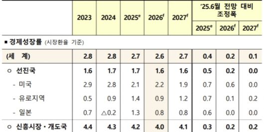 반면 유로존은 미국의 관세 정책과 러시아-우크라이나 전쟁에 따른 에너지 가격 부담으로 2026년 성장률이 0.9%로 0.5%포인트 하락할 전망이다. 일본 역시 일시적 무역 증가 효과 소멸과 대외 여건 악화로 성장률이 0.8%에 그칠 것으로 분석됐다.
