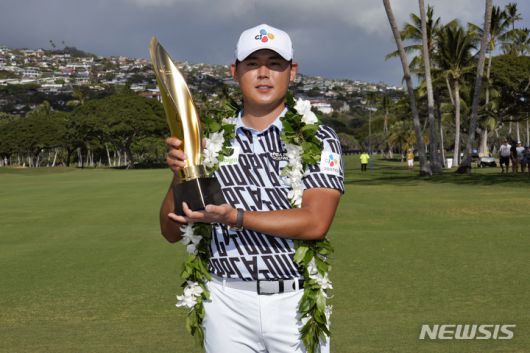 [호놀룰루=AP/뉴시스] 김시우가 15일(현지시간) 미 하와이주 호놀룰루의 와이알레이 컨트리클럽에서 열린 미국프로골프(PGA) 투어 소니 오픈 정상에 올라 트로피를 들고 포즈를 취하고 있다. 김시우는 최종 합계 18언더파 262타로 정상에 올라 결혼 후 첫 승, PGA 통산 4승을 달성했다. 2023.01.16. |