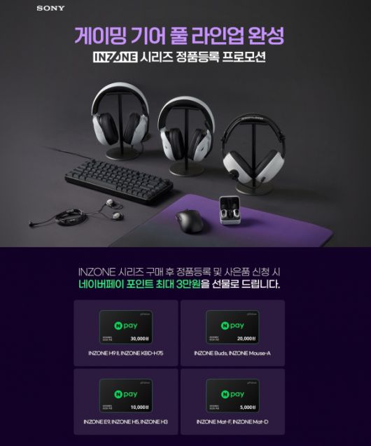 프로모션 기간 중 INZONE 시리즈 제품을 구입하고 3월 22일(일)까지 소니코리아 고객지원 사이트(scs.sony.co.kr)에서 정품 등록 후 사은품 신청을 완료하면 네이버페이 포인트를 받을 수 있다. 인존 H9 II∙인존 키보드 H75 구매 시 네이버페이 포인트 3만원, 인존 버즈∙인존 마우스 A 구매 시 네이버페이 포인트 2만원, 인존 E9∙인존 H5∙인존 H3 구매 시 네이버페이 포인트 1만원, 인존 마우스패드 F∙인존 마우스패드 D 구매 시 네이버페이 포인트 5천원을 증정한다.