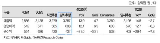 이지은 대신증권 연구원은 14일 보고서에서 “작년 4분기 매출액 3조2867억원(전년 동기 대비 13.9% 증가), 영업이익 6078억원(전년 동기 대비 12.1% 증가)으로 매출과 영업이익 모두 컨센서스에 부합할 것”이라고 밝혔다.