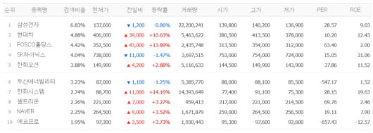 14일 네이버페이증권에 따르면 검색 상위 종목은 삼성전자, 현대차, POSCO홀딩스, SK하이닉스, 한화오션, 두산에너빌리티, 한화시스템, 셀트리온, 네이버, 에코프로 등이다.