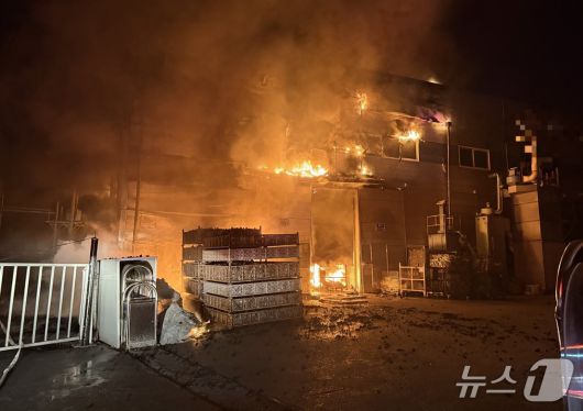(고령·포항=뉴스1) 신성훈 기자 = 14일 오전 2시 31분 경북 고령군 개진면 자동차부품 제조 공장에서 불이 났다.