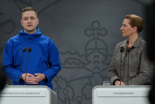 13일(현지시간) 덴마크 코펜하겐에서 옌스-프레데리크 닐센(왼쪽) 그린란드 총리와 메테 프레데릭센 덴마크 총리가 기자회견에 참석하고 있다. (사진=로이터) |