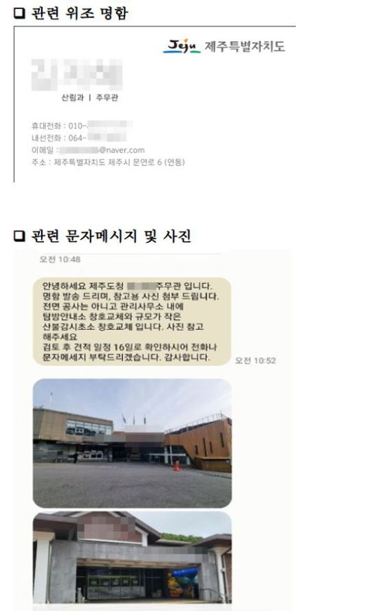 제주도 관계자는 "공무원이 개인 명의로 문자메시지를 보내 견적을 요청하거나 선납·대납을 요구하는 일은 없으며, 모든 공사·물품 계약은 정해진 행정절차와 공식 공문을 통해서만 진행된다"고 강조했다.