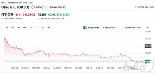 13일(현지 시각) 뉴욕증시에서 월가의 대표 원전주 오클로는 5.28% 급락한 97.09달러를 기록했다.