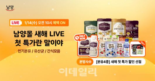 [이데일리 신수정 기자] 남양유업(003920)은 14일 오전 10시 자사몰 ‘남양몰’에서 ‘새해 LIVE 첫 특가’ 프로모션을 진행한다고 밝혔다. 이번 라이브 방송은 인기 조제분유와 아기 간식 등 주요 제품을 최대 68% 할인한 가격에 선보인다.