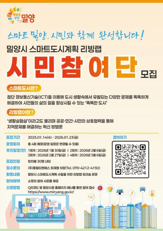 [밀양=뉴시스] 스마트도시 리빙랩 시민참여단 모집 포스터. (사진= 밀양시 제공) 2026.01.14. photo@newsis.com *재판매 및 DB 금지 |