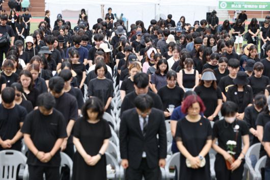 서울 서초구 서울교육대학교 대운동장에서 초등교사노동조합 주최로 열린 서이초등학교 교사 사망 1주기 추모식에서 교사들이 묵념하고 있다. /연합뉴스 |