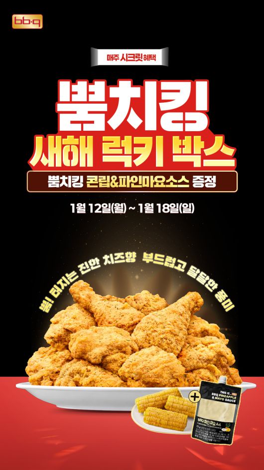 (서울=뉴스1) 이형진 기자 = 제너시스BBQ 그룹은 18일까지 BBQ앱 및 웹사이트를 통해 뿜치킹을 주문한 고객에게 '뿜치킹 콘립'과 '파인마요소스'를 증정하는 '뿜치킹 새해 럭키 박스 2차 캠페인'을 진행한다고 14일 밝혔다.