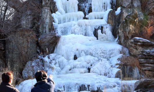 강추위가 이어진 13일 인천 연수구 한 음식점 앞 인공폭포가 얼어 있다. 연합뉴스 |