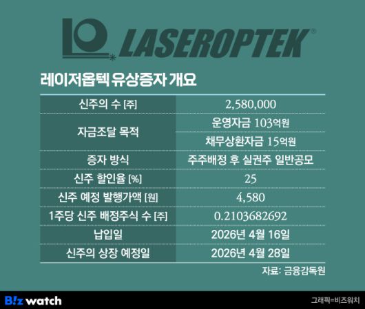 레이저옵텍은 주주서한을 통해 “대외 경영 환경의 불확실성이 커지는 가운데 안정적인 사업 운영과 중장기 경쟁력 강화를 동시에 도모할 필요성이 커졌다”며 “일시적 재무 대응이 아닌 향후 사업 지속성과 재무건전성을 고려한 선제적 조치로서 유증 공모 발행을 추진하게 됐다”고 설명했다.
