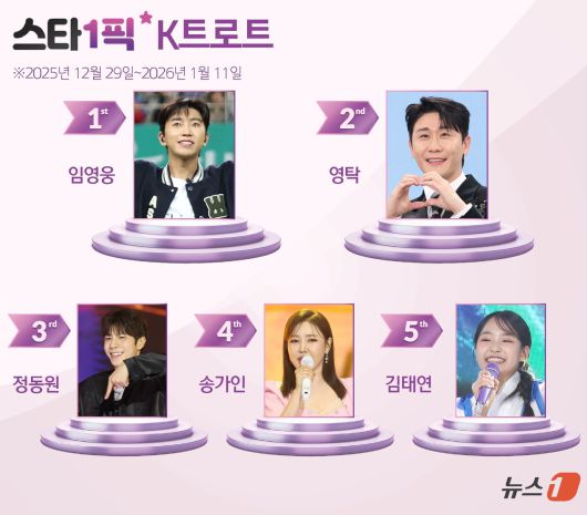 [편집자주] K팝 아이돌은 어느덧 글로벌 대세로 우뚝 섰습니다. K트로트 가수들 역시 그 어느 때 보다 많은 사랑을 받고 있습니다. 이에 뉴스1은 이들의 생생한 사진, 최신 기사, 화제 동영상을 한 곳에서 만날 수 있는 원스톱 플랫폼 [스타1픽]을 신설했습니다. 뉴스1은 [스타1픽]과 관련해 'K팝 아이돌'과 'K팝 트로트 스타' 중 최근 2주간 가장 많은 관심을 받은 사진의 주인공들을 1~5위까지 소개하는 [스타1픽-K팝] 및 [스타1픽-K트로트] 코너도 마련, 팬들에 최신 정보와 최고의 즐거움을 함께 제공하고자 합니다.
