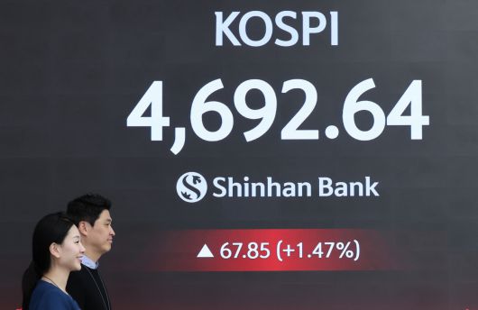 13일 서울 중구 신한은행 본점에 코스피 지수가 표시되고 있다. 이날 코스피 지수는 전장보다 67.85포인트(1.47%) 오른 4692.64에 장을 끝냈다. [연합] |
