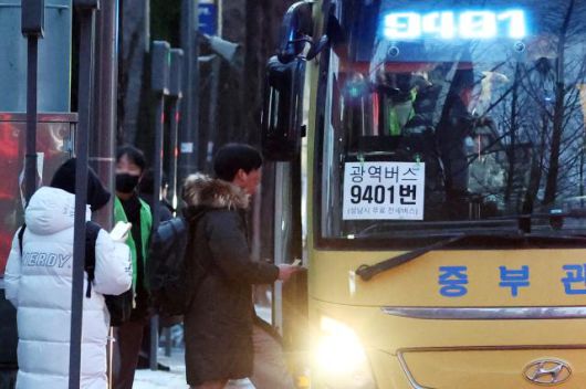 서울 시내버스 파업 이틀째인 14일 성남 이매촌 한신 아파트 인근 버스 정류장에서 분당과 서울역을 오가는 9401 전세버스가 운영되고 있다. [사진=연합뉴스] |