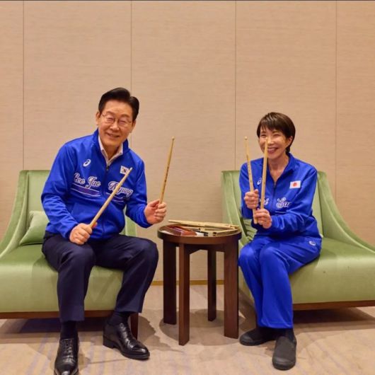 이재명 대통령과 다카이치 사나에 일본 총리가 이 13일 오후 일본 나라현에서 열린 한일 정상회담 후 친교 시간에 다카이치 총리가 좋아하는 드럼을 함께 치며 친밀한 한일 관계를 상징하는 즉석 드럼 합주를 선보였다. 한일 정상이 드럼 스틱을 들고 기념사진을 찍고 있다. [사진=KTV] 2026.01.13 |