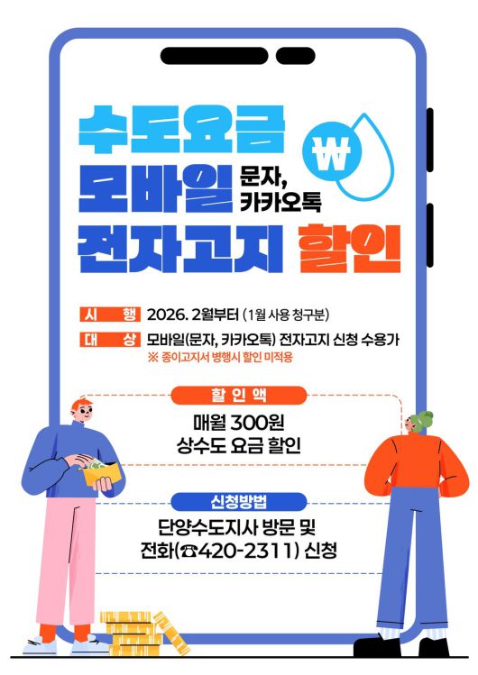 충북 단양군이 군민의 요금 납부 편의를 위해 수도요금 모바일(문자·카카오톡) 전자고지 할인 제도를 2월부터 시행한다고 14일 밝혔다.