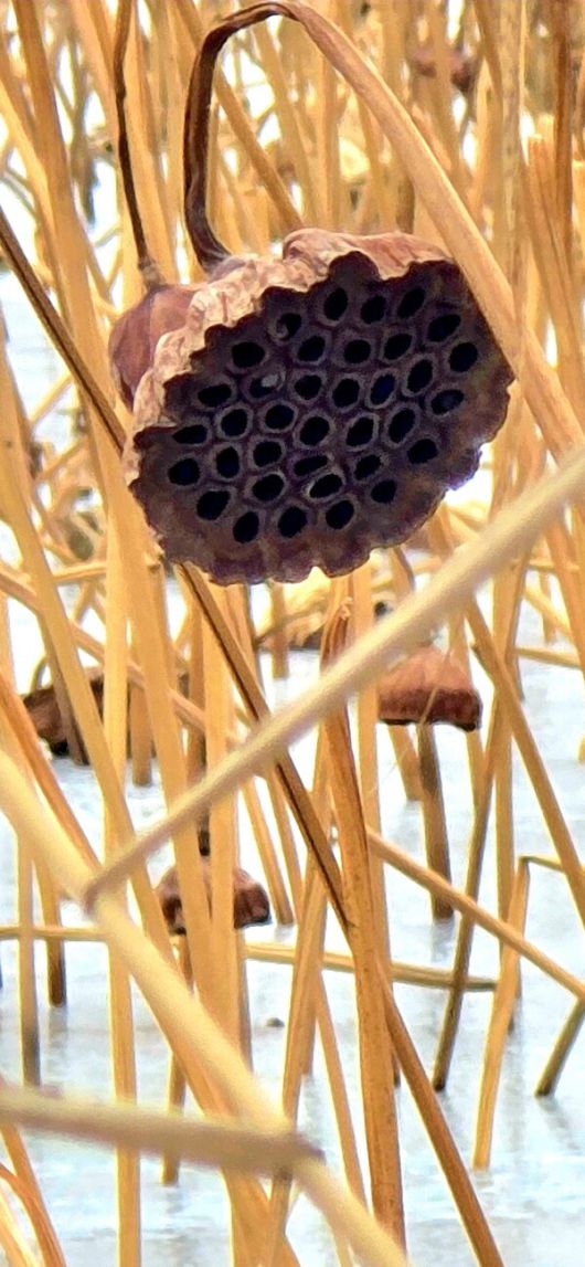 얼어붙은 강가에 남아 있는 연밥을 바라봅니다.