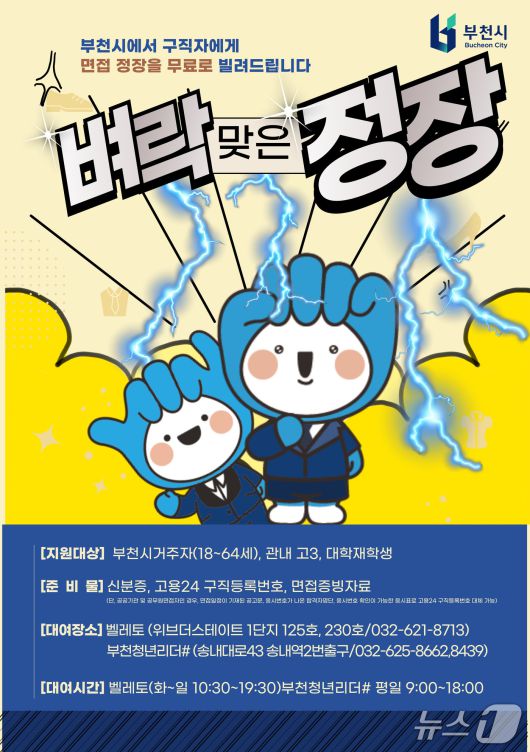 이용 희망자는 신분증 등 관련 증빙자료를 지참해 '부천청년리더샵' 또는 정장 대여 업체 '벨레토'를 방문하면 정장 상·하의와 구두, 넥타이, 액세서리 등을 최대 4일간 무료로 빌릴 수 있다.