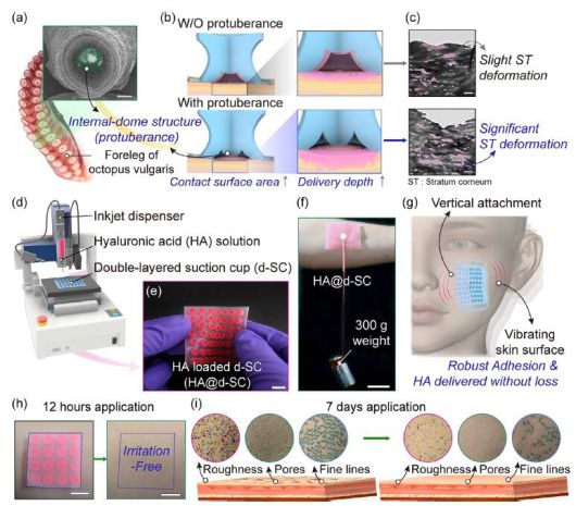 연구팀이 개발한 맞춤형 흡착 패치는 문어 빨판 내부에 있는 독특한 돔(Dome) 형태의 돌기 구조에 착안했다. 이 구조는 피부 접촉 면적을 극대화하고 강력한 음압을 형성해 피부 각질층을 일시적으로 변형시켜 약물 침투를 촉진하는 원리를 적용했다.